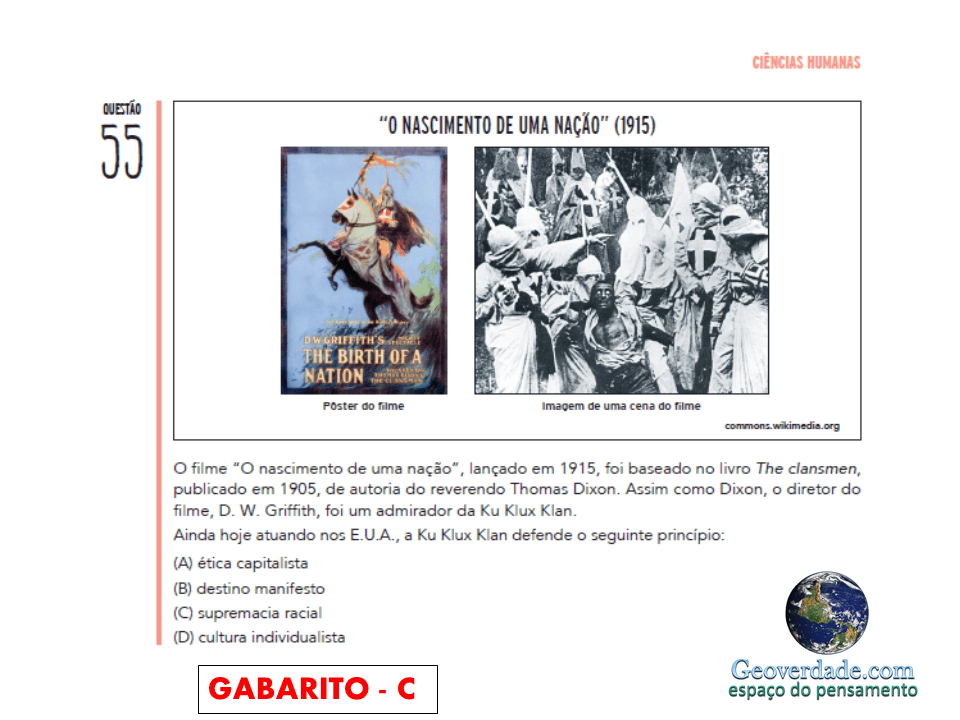 O conceito de nação foi desenvolvido no gabarito da questão 53, no entanto, devemos compreender que ela pode se tornar um projeto ideológico quando sua “construção” atende interesses. Nos EUA, os grupos que controlavam o poder político/econômico idealizam uma nação branca e cristã.