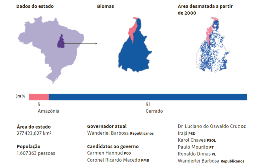 Com cerca de 91% do território ocupado pelo cerrado e 9% pela Amazônia, o Tocantins sofre principalmente com o desmatamento oriundo da grilagem e do avanço da agropecuária.