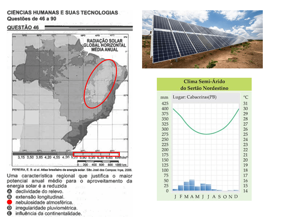 A questão envolve a compreensão de informações gráficas, conhecimento das características dos climas brasileiros e suas respectivas áreas de ocorrência, bem como, saber refletir sobre o uso incipiente de fontes limpas e renováveis num país em busca de sua autonomia energética.