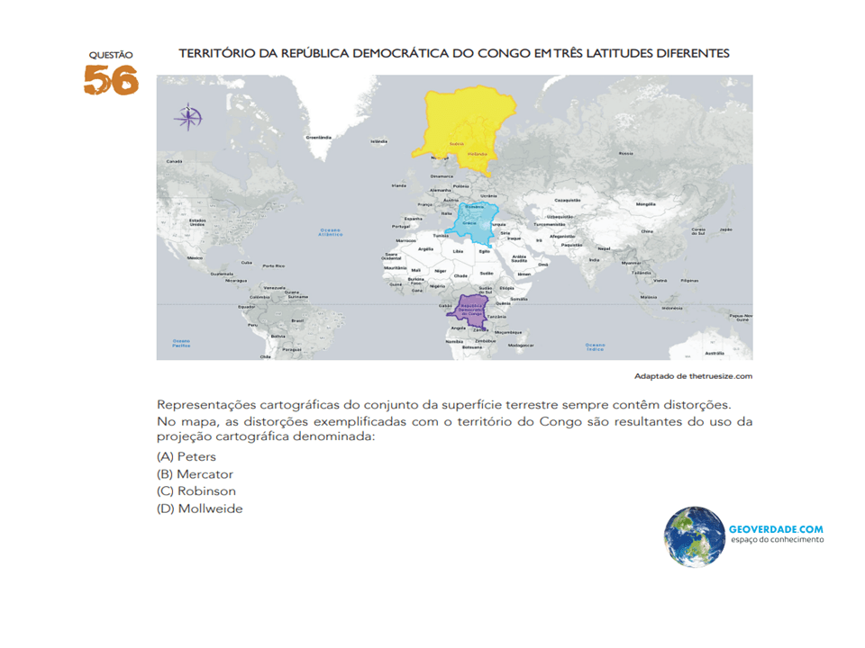 (B) Mercator: A projeção de Mercator é famosa por distorcer as áreas, especialmente à medida que se aproxima dos polos. Esta projeção aumenta o tamanho das áreas de terras em latitudes mais altas, enquanto as regiões próximas ao equador, como o Congo, aparecem menores do que realmente são. Esta é a projeção que resultaria nas distorções exemplificadas no mapa mencionado na questão.