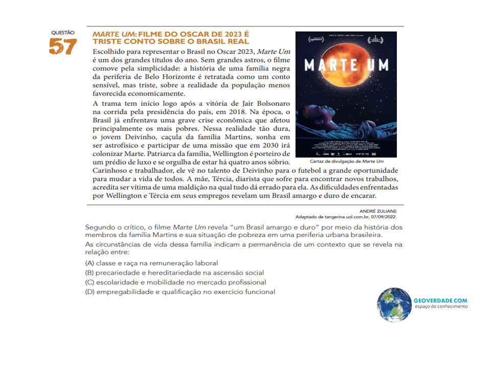 (B) Precariedade e hereditariedade na ascensão social: Essa alternativa sugere que a precariedade e a falta de recursos são passadas de geração em geração, dificultando a ascensão social. Isso também pode ser uma realidade para a família retratada no filme, mas a questão parece focar mais nas disparidades estruturais ligadas à classe e à raça.