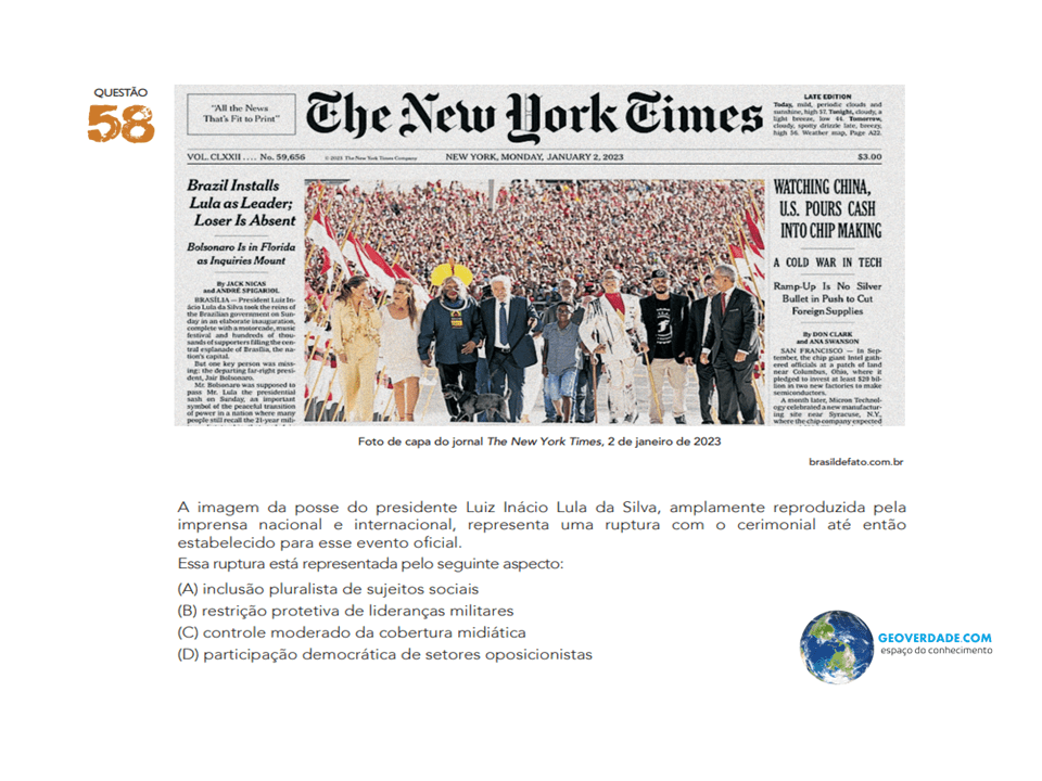 (A) Inclusão pluralista de sujeitos sociais: Esta é a opção correta. A posse de Lula em 2023 incluiu a participação de pessoas representativas de diversos grupos sociais, como indígenas, negros, trabalhadores, e outros segmentos da sociedade que historicamente têm sido marginalizados. Isso representou uma ruptura significativa com as práticas tradicionais de posse, que geralmente se concentravam em figuras políticas e militares.