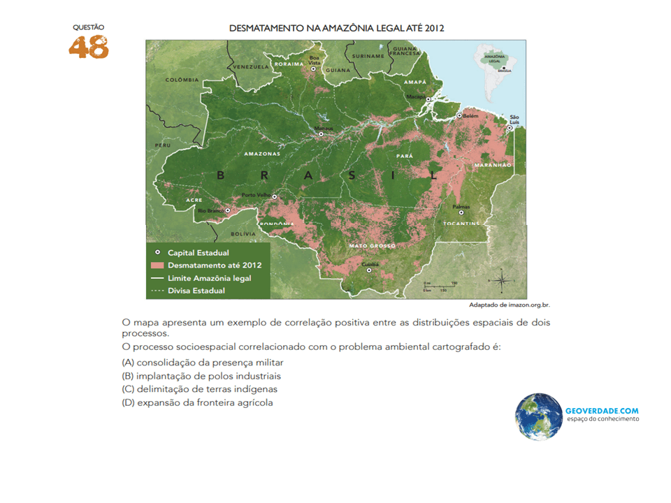 (D) Expansão da fronteira agrícola: Esta opção é a mais provável, pois a expansão da fronteira agrícola, especialmente no contexto brasileiro, está diretamente associada a problemas ambientais como desmatamento, degradação do solo, perda de biodiversidade e conflitos de terras. Este processo ocorre principalmente em áreas de floresta tropical e cerrado, onde o avanço da agricultura e pecuária tem grande impacto ambiental.