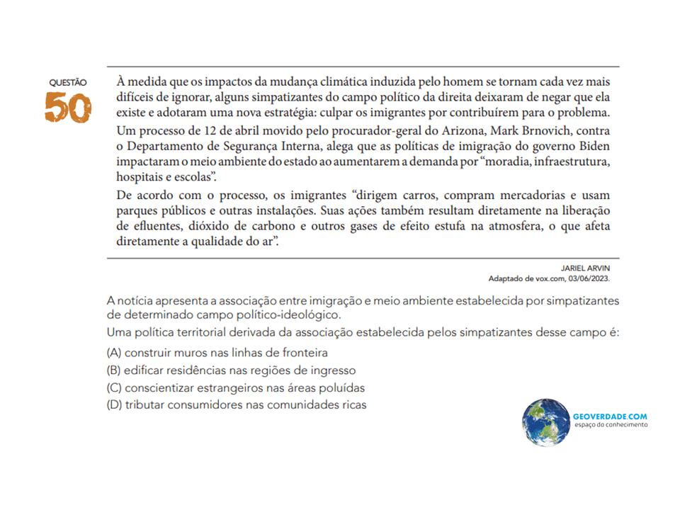 (A) Construir muros nas linhas de fronteira: Esta opção é a mais plausível no contexto político-ideológico que associa imigração a problemas ambientais. Grupos nacionalistas ou conservadores, especialmente em alguns países, defendem a construção de muros ou barreiras físicas nas fronteiras como uma forma de limitar a imigração, argumentando que a imigração em massa pode pressionar recursos naturais e afetar o meio ambiente.