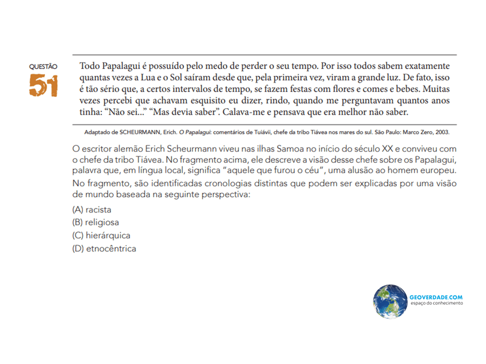A questão apresenta um fragmento no qual o chefe de uma tribo nas ilhas Samoa expressa sua visão sobre os “Papalagui,” um termo usado para se referir aos europeus. A análise se concentra na identificação de cronologias distintas e como essas podem ser explicadas por uma visão de mundo particular.