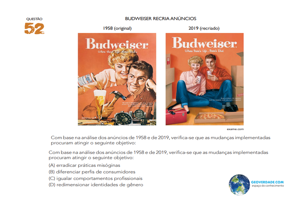 (D) Redimensionar identidades de gênero: Esta é a opção mais adequada. Anúncios modernos, especialmente em comparação com os de décadas passadas, têm procurado redimensionar e reavaliar identidades de gênero, refletindo mudanças sociais em torno da compreensão de masculinidade, feminilidade, e papéis de gênero. Esse redimensionamento busca reconhecer e valorizar uma maior diversidade de identidades e expressões de gênero.