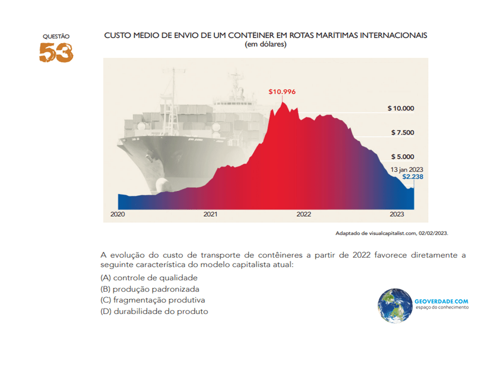 (C) Fragmentação produtiva: Essa é a opção mais adequada. A fragmentação produtiva, ou cadeia global de valor, é um processo onde diferentes partes da produção de um bem são realizadas em diferentes locais ao redor do mundo, com base em vantagens comparativas como custos de mão de obra, tecnologia, ou logística. A redução no custo de transporte de contêineres facilita essa fragmentação, pois torna mais viável economicamente a distribuição das várias etapas da produção globalmente.