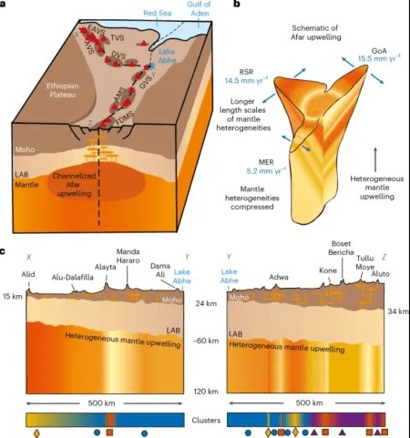 A Região de Afar, na Etiópia, está situada sobre uma pluma de manto quente que se comporta como um coração pulsando. A pesquisa, liderada por cientistas das universidades de Southampton e Swansea, no Reino Unido, confirma que, a cada “batida”, envia ondas de calor e material fundido para cima, enfraquecendo a crosta terrestre.